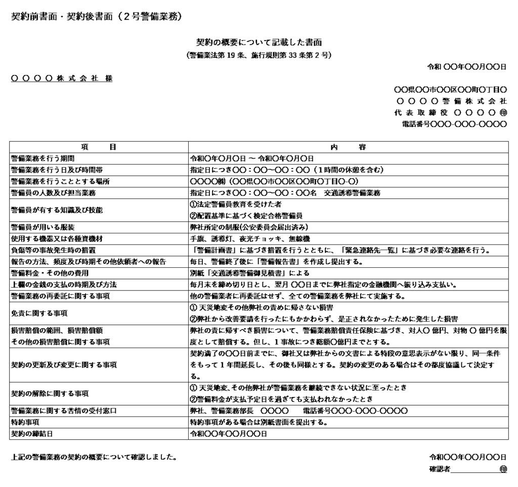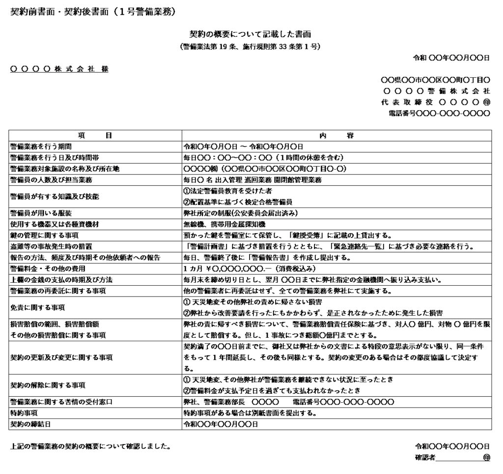 下記が1号警備業務と2号警備業務の契約前書面・契約後書面の必要記載事項と書面例です。