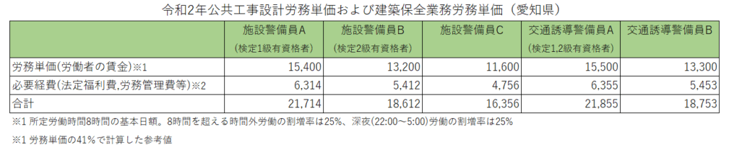 最近は人手不足の影響で毎年3%程度あがっており、令和2年の愛知県の警備員の労務単価は以下のようになっています。