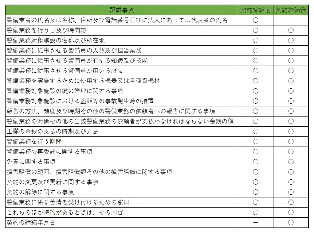 契約前書面・契約後書面の必要記載事項(2号警備業務)