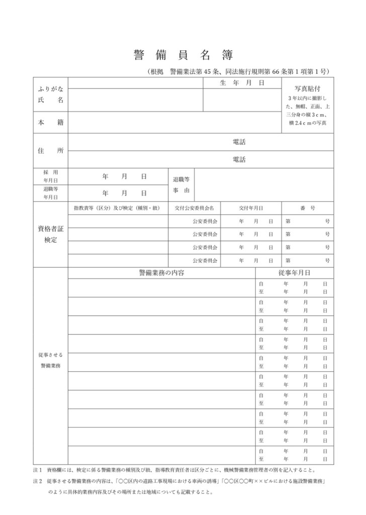 名簿に記入する項目や、添付する書類などは、警備業法施行規則第66条第1項の第1号に詳細が書かれていますので参考にしてください。