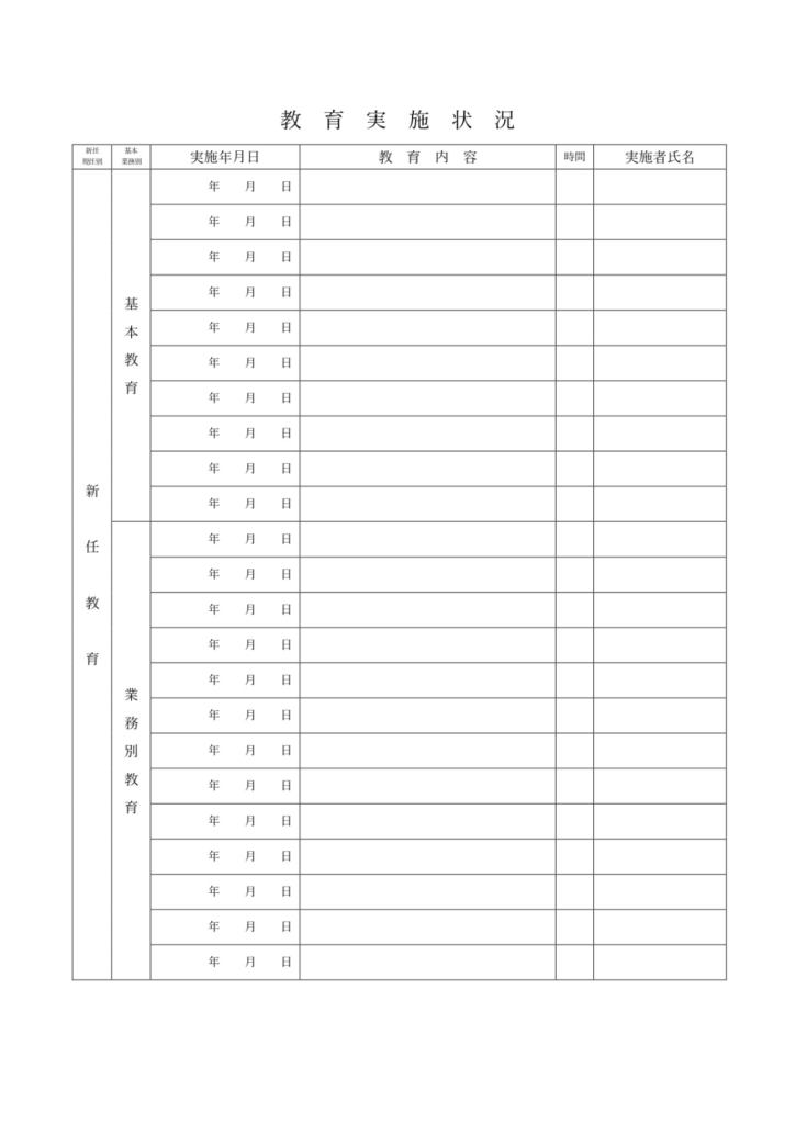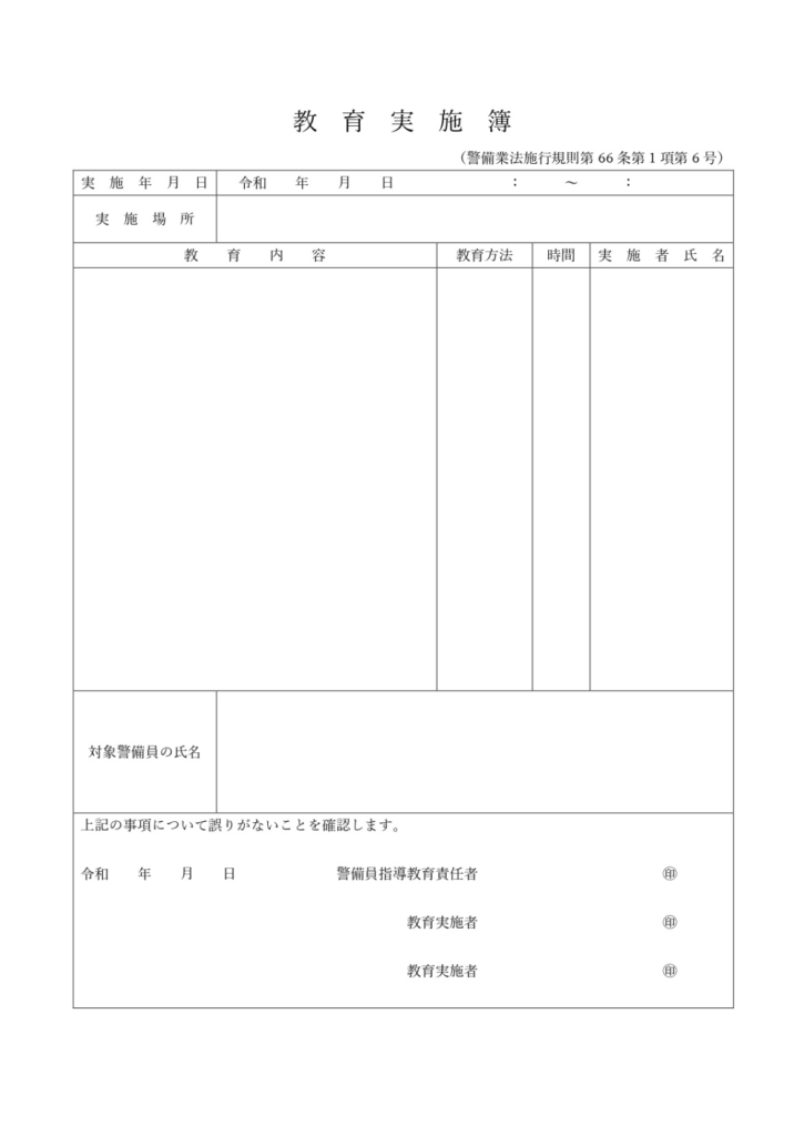 警備業法施行規則第66条第1項第6号にて警備員の教育実施簿を作成し、備え付けておくようにと定められています。