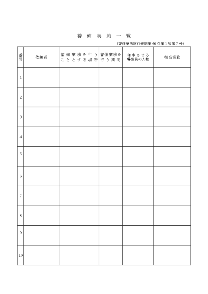 警備業法施行規則第66条第第1項の第7号にて、警備業者に契約先の一覧表を作成し、備え付けておくようにと定められています。