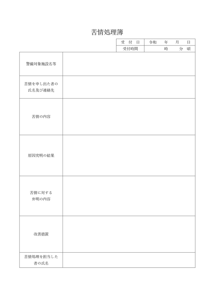 警備業法施行規則第66条第1項の第8号にて、警備業者は苦情処理簿を備え付けるようにと定められています。