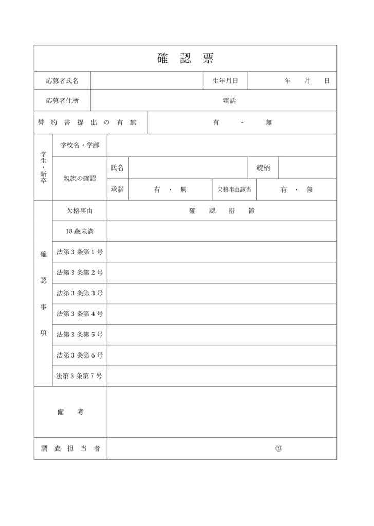 警備業法第45条(警備員の名簿等)で定められている備え付け書類の中の欠格事由に該当しないことの確認措置書面の部分についてみていきます。