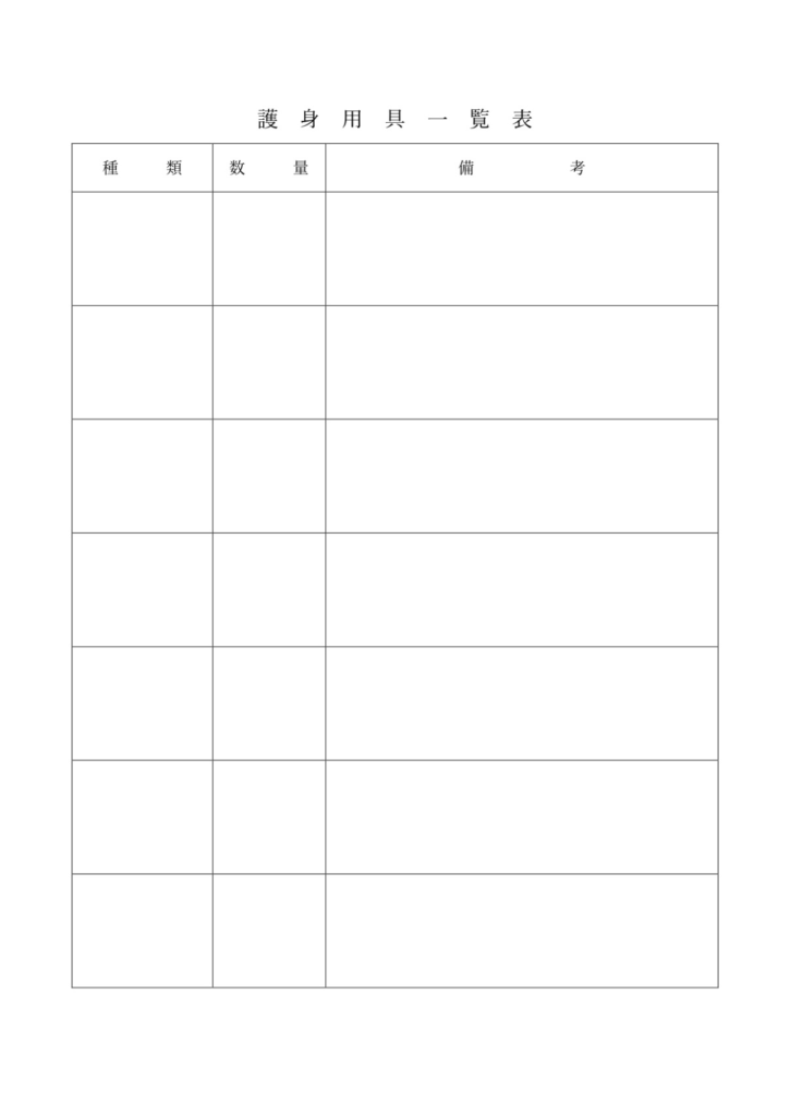 警備業法施行規則第66条第1項の第3号にて、警備業で使う護身用具の種類ごとに数量を記入した書面を備え付けるようにと定められています。