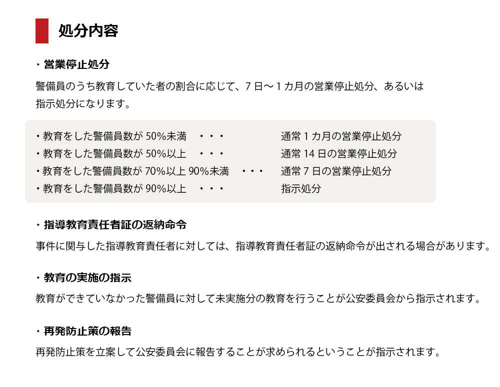 ここでは、警備会社における、よくある警備業法違反事例と予想される営業停止処分などの内容についてみていきます。