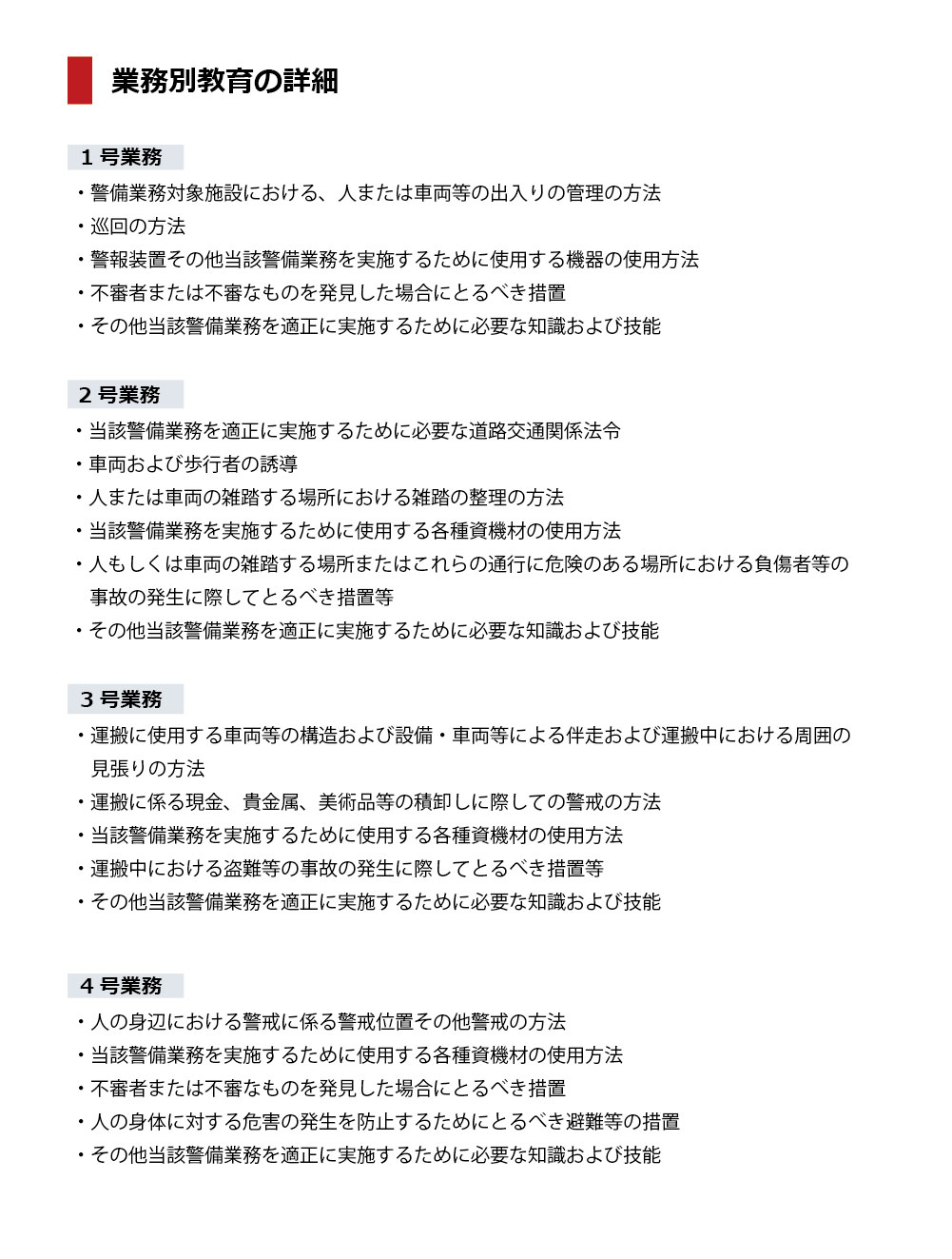 先に述べました1~4号までの業務内容に応じて、警備員指導教育責任者が教育に当たります。