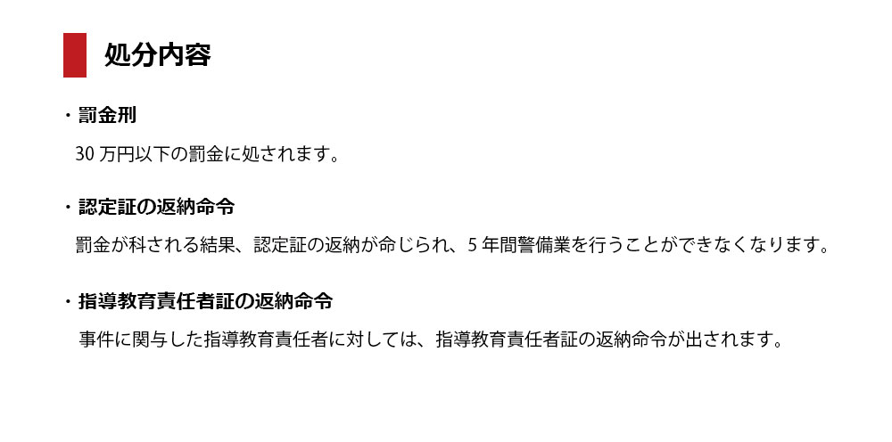 なぜなら、教育実施簿の虚偽記載は、行政処分だけではなく罰金刑が科されるところ、警備業法8条2号で、罰金刑を科された警備業者に対しては認定証の返納を命じることになっているからです。