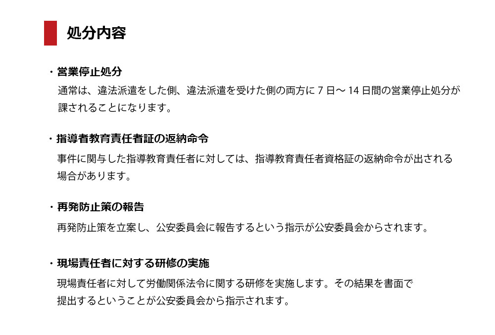 この違反に関しては、基本的に「違法派遣」と同じ処分となります。しかし、「営業停止」においては少し内容が異なってきますので注意してください。