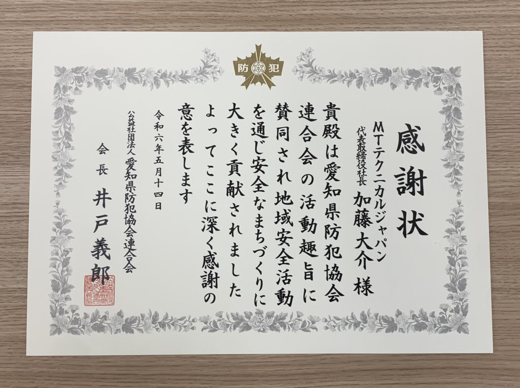 令和6年5月14日、弊社MTテクニカルジャパンは、愛知県防犯協会連合会より感謝状を授与されました。 この栄誉は、弊社が地域安全活動に貢献したことに対して贈られたものです。 弊社の取り組みが評価され、このような形で表彰されることを大変光栄に思いま... -