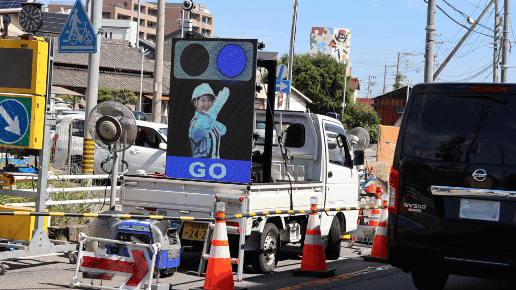 従来の交通誘導は警備員が現場で直接行っておりましたが、KB-eyeはカメラとAIシステムを用いて周辺状況を自動で把握し、LEDモニターで「STOP」「GO」の合図を分かりやすく表示します。